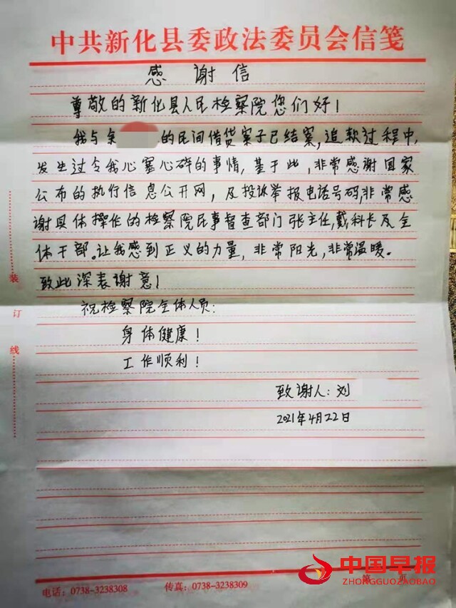 中国早报湖南讯( 肖连金 张志凌)“非常感谢具体操作的检察院民事督查部门张主任,戴科长及全体干部。让我感到正义的力量,非常阳光,非常温暖。” 4月23日,刘某平专程赶到新化县检察院将亲笔感谢信送到第四检察部,用最质朴的方式和语言,向检察官表达自己由衷的谢意,感谢他们帮自己追回近六年的欠款。