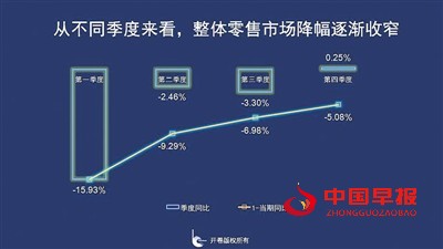 从时间轴来看,整体零售市场第一季度受疫情影响最为严重,同比下降15.93%,二季度复工复产复学急速收窄降幅,三季度同比下降3.3%,降幅略增,到第四季度回暖,同比出现小幅上涨,上升了0.25%。