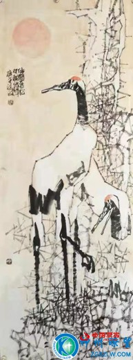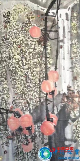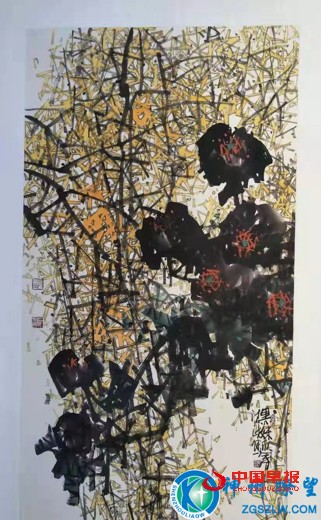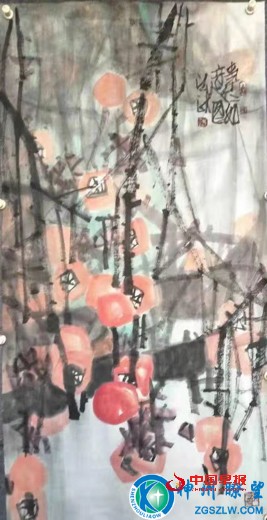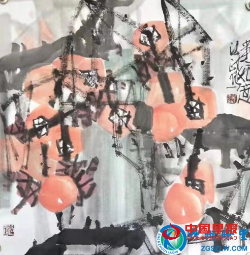 庞德政的作品用墨技法独特,构图简洁大方,夸张之处而不空浮、抽象之处不失大气,在似于非似之间处理上技法独特,无论远看近观,都给人一种新颖、大气、华丽、清静之感,他的硕果图火红的柿子用墨是一点成型,无论从哪个角度看,都是丰满圆润、色泽艳丽令人垂涎,枝干用墨轻重适度,疏密相间,苍劲枝干的沧桑,火红柿子的泽润,衬托出一幅完美的丰收喜悦,令人入境其中。