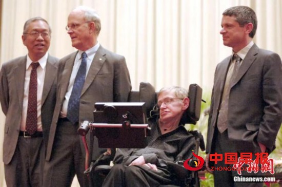 2006年,世界著名科学家丘成桐(左至右)、大卫·格罗斯(David Gross)、斯蒂芬·霍金(Stephen Hawking)、安地·斯特罗明格(Andrew strominger)出席国际弦理论大会。中新社记者 徐曦弋 摄