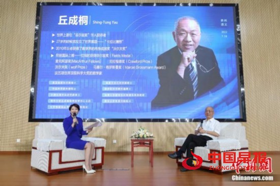 2022年7月18日,丘成桐在“求真游目”全国巡讲的首场讲座中分享数学的广泛运用。中新社记者 瞿宏伦 摄