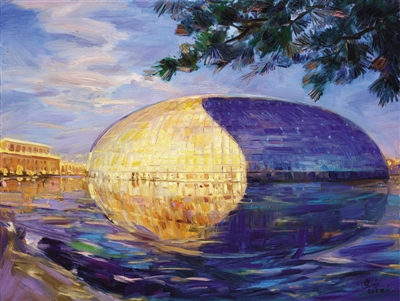 范迪安油画《夏夜明珠》——夕阳洒下余晖,晚风掠过树梢。艺术殿堂宛如一颗璀璨的明珠,镶嵌于粼粼水面之上,照亮大众精神文化生活。