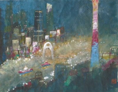 李劲堃中国画《万家灯火耀珠江》——江风轻拂耳畔,江水倒映明月。