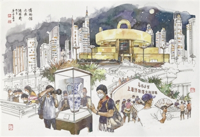 张安朴水彩画《博物馆之夜》——看最新特展、逛文创集市、品江南糕点……博物馆奇妙夜精彩依旧,带领人们穿越时空,与历史、文化、艺术近距离对话。