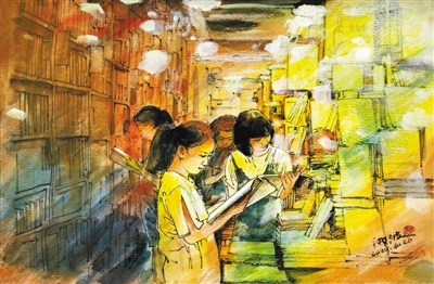 陈湘波水彩画《鹏城书香浓》——温暖的灯光、浓郁的书香,不打烊书店作为心灵的栖息所,为奔波劳碌了一天的人们筑起精神之乡。