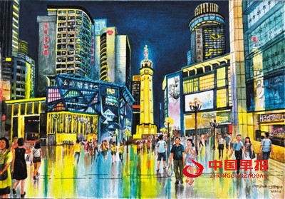 陈树中水彩画《不夜城·解放碑》——城市华灯初上,特色商圈车水马龙。购物、餐饮、休闲、娱乐……丰富多彩的夜生活从这里开始。