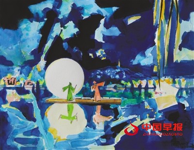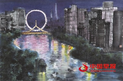 马驰中国画《“天津之眼”》——巨大的摩天轮缓缓转动,送走夕阳,迎来月光。绚丽的灯火流转于水天之间,擦亮美丽的城市名片。