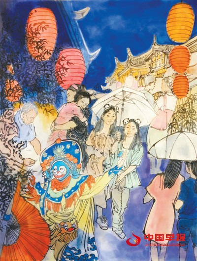 李青稞中国画《夏夜宽窄巷子》——青砖黛瓦里潜藏着老街生活,餐馆商铺里洋溢着时尚气息。夜色为古街新巷披上一层迷人面纱,不妨放慢脚步,尽情欣赏。
