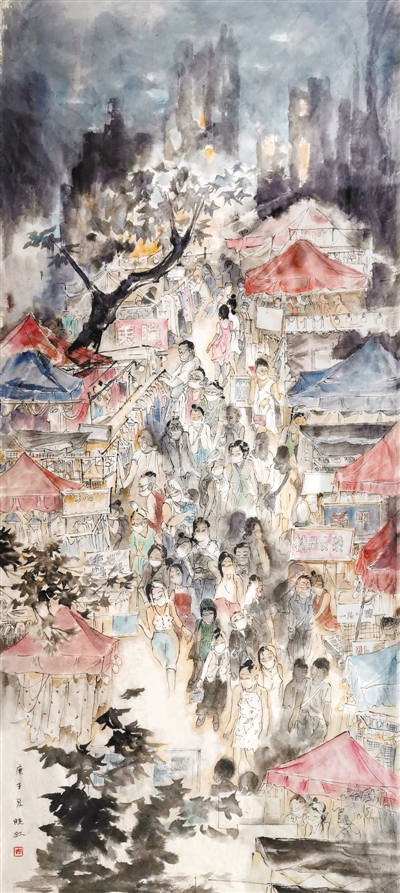 谢晓红中国画《武汉夜未央》——熙熙攘攘的人群,此起彼伏的吆喝,喧闹的夜市带来久违的烟火气,这座城市的活力持续绽放。