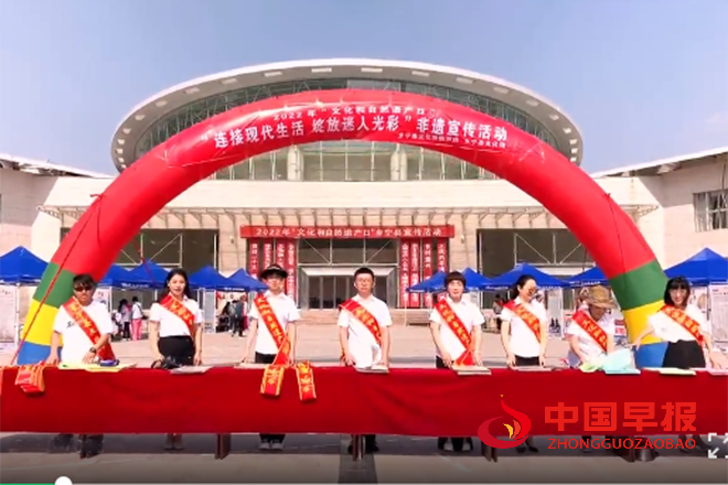 中国早报 山西讯(记者 赵玉虎)2022年6月11日是第17个“文化和自然遗产日”。为进一步提高人民群众非物质文化遗产保护意识,传承、弘扬中华优秀传统文化,营造非遗保护良好社会氛围,在做好新冠肺炎疫情防控工作的前提下,由县文化和旅游局主办,县文化馆承办的2022年“文化和自然遗产日”乡宁县非遗宣传活动于6月11日上午9点在文体中心广场成功举办。本次宣传活动的主题是“连接现代生活·绽放迷人光彩”。县人民政府副县长贺伟科、文旅局局长杜浩江、文旅局副局长闫宏、文旅局副局长闫宏伟、县文化馆馆长张皓及全馆人员参加了本次宣传活动。