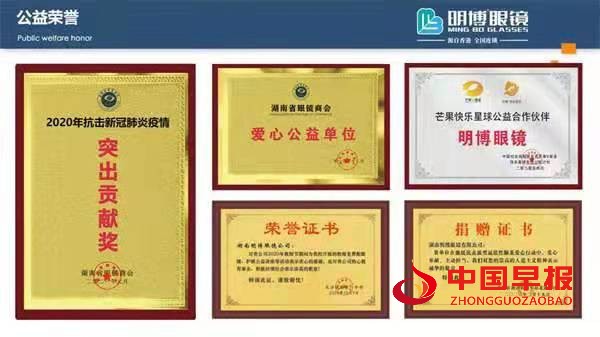 【人生要做有意义的事情】全年组织到校园及街道社区为青少年做爱眼护眼视光知识讲座,免费做视力筛查,对视力有问题做进一步的视力防控等一系列的公益活动。更是成为中国社会福利基金会芒果V基金,快乐星球专项公益计划的一员,去为这个社会贡献出一份自己的力量。 正是因为这份爱心以及长久以来对于公益的坚守,得到了社会的认可,明博眼镜董事长唐爱良先生于2020年被评选为“长沙好人”。少年振衣,岂不可作千里风幡看?少年瞬目,亦可壮作万古清流想。明博眼镜也将继续在专业上精益求精,在公益上保持初心。明博眼镜,谱写全国的眼镜行业传奇,传递一个又一个的社会大爱。