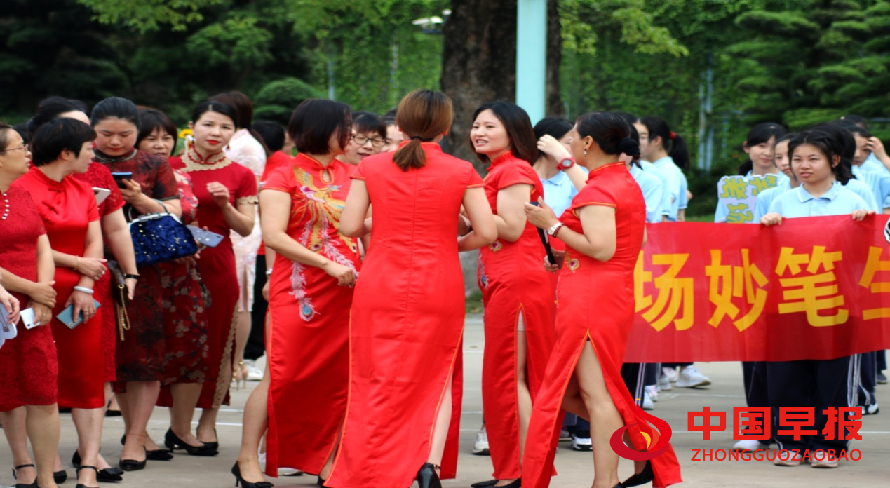 九年磨剑试锋芒,父母助子盼功名。家长们有的穿着标有中考祝福语的红T恤,有的穿着“棋开得胜”寓意的旗袍,有的拉着一条条励志红幅,为孩子们加油打气。“参加中考壮行活动,我们比孩子还激动、兴奋,仿佛我们也回到了学生时代,同时我们更希望孩子们能感受到来自父母的鼓励。”几位904班的年轻妈妈说。