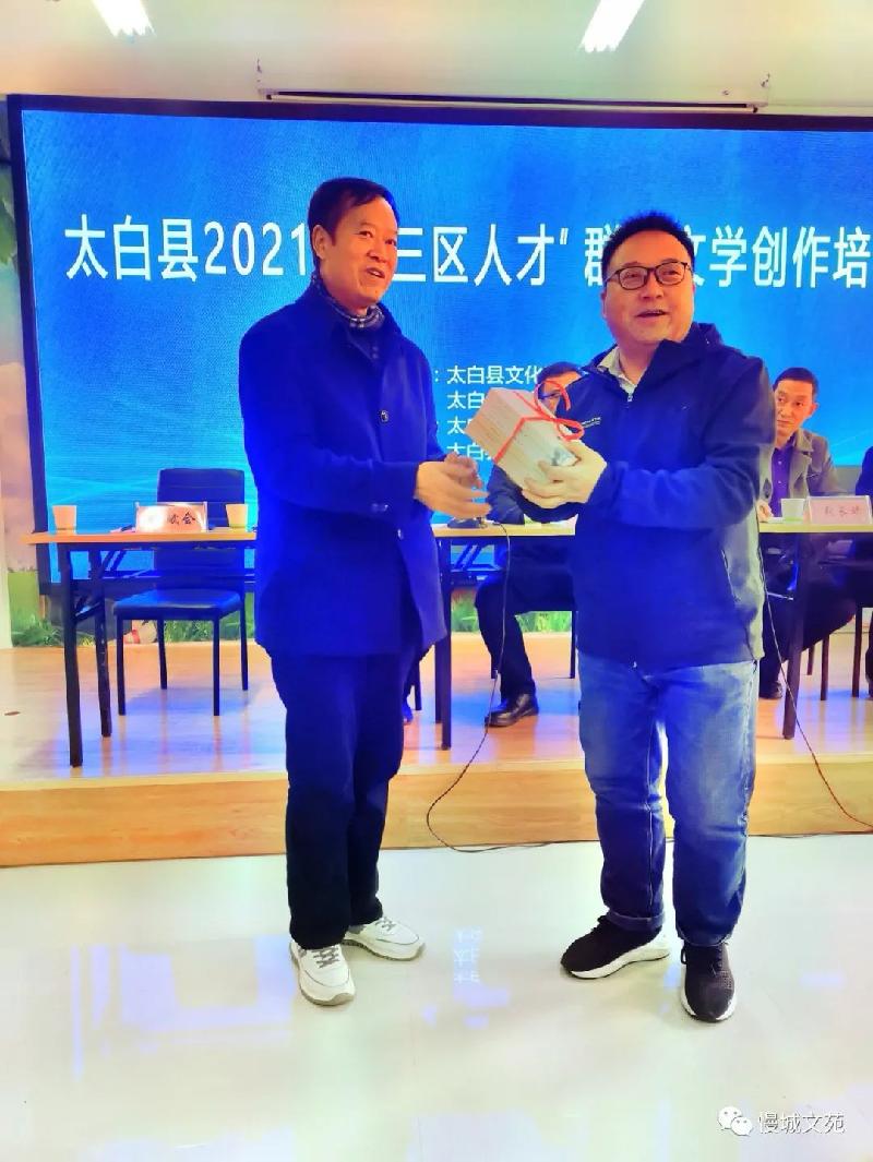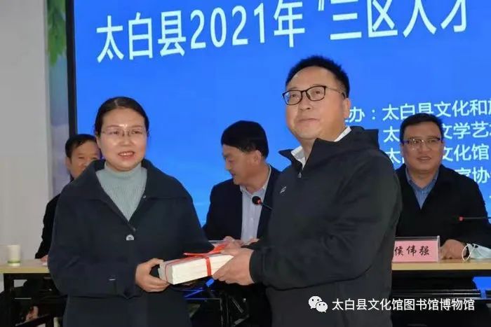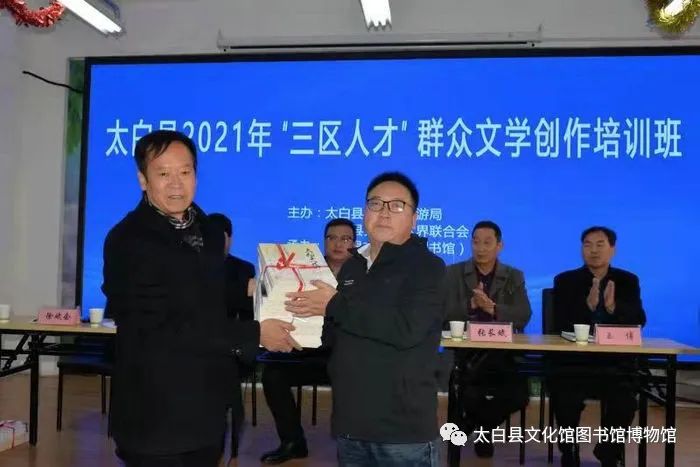 开班仪式上,由太白县作家协会为太白县文化馆(图书馆)赠送了《太白文艺》出刊以来的所有期刊,太白县作家协会主席徐斌会、副主席张江丽分别为太白县文化馆(图书馆)赠送了个人专辑《掬情热土》《在这里慢下来》和《快乐是简单的》散文集。