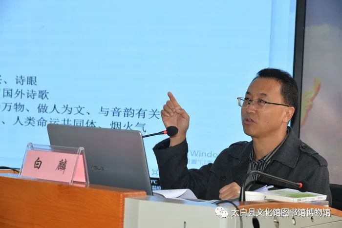 10月29日上午,白麟老师以《诗经在新世纪的现实意义》为题,从诗的解读、诗经、诗人、诗歌的说文解字,诗歌的诗心、诗情、诗意、诗兴、诗眼五重境界,诗歌的语言特点,诗经的现实意义及怎么捕捉灵感怎么写五方面为广大学员进行了深入浅出的讲解,使参会学员受益匪浅。培训期间,白麟老师还为县档案局和县文化馆及广大学员赠送了《白麟诗歌研究》等书籍。