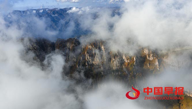 中国早报 山西讯(特约记者 田红萍)10月13日,雨后的山西霍州七里峪,成了自然挥毫的诗画长卷。群峰如披甲巨人耸立天地,嶙峋岩壁似经千载刀削斧凿,在流动的云海中半隐半现,将岁月的厚重凝于每一道岩纹。