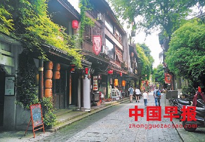 都正街不长,三百来米。从街口晃到街尾,感觉如进了某个老长沙人收藏细软和珍宝的隐秘地,满目都是好风物:一卷麻石铺地、绿叶悬壁的长街,两边站立着画了门神的老墙,挂了红灯笼、高不过三四层楼的老铺子、旧公馆,还有老师傅炸爆米花和拉黄包车的场景雕塑以及一家家汉服店、茶楼、老酒馆……这老味道新气息组合的一切,皆在宁静的日光和厚实的绿荫里。